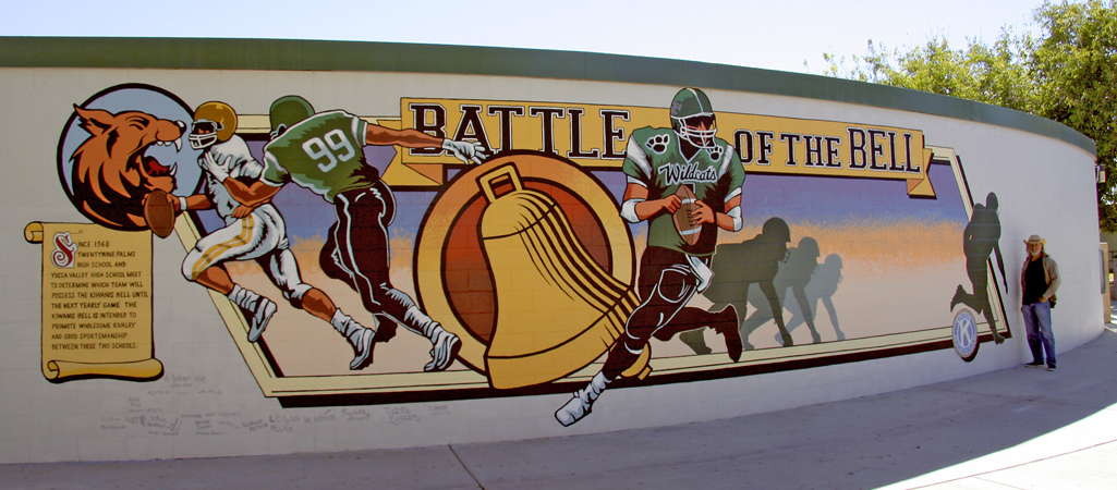 Since 1968, Twentynine Palms High School and Yucca Valley High School football teams have competed in a yearly game to determine which team will possess the Kiwanis Bell, a coveted trophy that was intended to promote wholesome rivalry and good sportsmanship between the two schools. This mural designed by Los Angeles artist Art Mortimer was the city's second Mural-in-a-day project, painted by three assistants and 17 students.