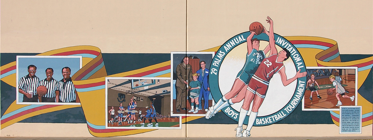 For more than 40 years, the annual Boys Basketball Tournament, hosted by the City of Twentynine Palms Recreation Dept., has drawn hundreds of competitive youngsters from all over California, Nevada, and Arizona, during the last weekend of March. A "Mural-in-a-Day" project was created to celebrate the 44th tournament in 2002. Created by Los Angeles artist Art Mortimer, the mural was painted by a team of 21 local artists in one day on the 22-foot by 44-foot wall.