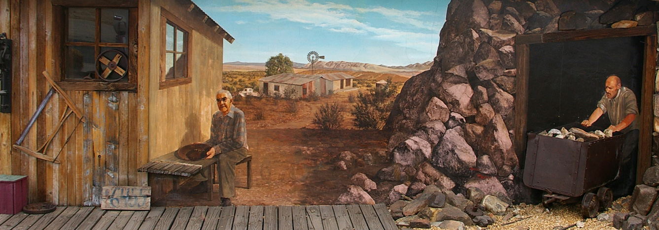 Prospectors Oran Booth and Bill Keys were an active part of desert gold mining in the 1900's. Oran Booth arrived in 1928 and filed a claim on the site that became the Wall Street Mill, prospected in Gold Park, and later worked the Paymaster Mine, a gift from his friend Keys. In 1933, he filed on the 80-acre homestead pictured in this mural. Bill Keys, who arrived in 1910, established more than 30 mining claims in the area that is now Joshua Tree National Park.