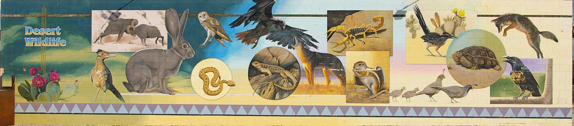 Featuring the desert critters that inhabit the valley and neighboring Joshua Tree National Park, which encompasses 800,000 acres and many species of wildlife within its protective boundaries. The mural had to be removed in 2007, after irreparable damage occurred to the wall, due in part to the harsh desert wind and sun.