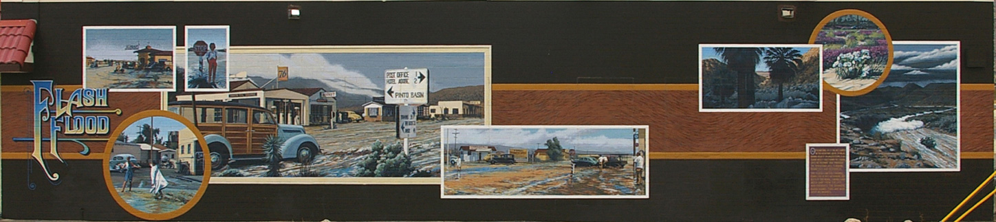 Before construction of the flood control channel in 1969 by the County of San Bernardino with the assistance of local engineer Bill Hatch, raging flash floods used to flow down from 29 Palms Canyon in what is now Joshua Tree National Park. The water would wash out the main road (now 29 Palms Highway), rushing east around Donnell Hill and into the center of town. While business owners lamented this deluge ruining their stores, local children joyously rode the waves in their inner-tubes and handmade boats.