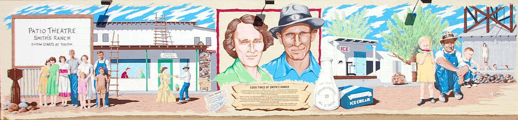 Bill Smith, who arrived in 1923 in his Model-T Ford, developed the haven known as Smith's Ranch. Bill and his brother, Harry, drilled a well and provided water to early homesteaders, and Bill's shower and swimming pool were a welcome place to cool off on hot summer days. Bill married Thelma Mead in 1930, and the ambitious pioneer couple built an ice house, a dairy, an ice cream parlor, an outdoor theater, a recreational hall, and a trailer park. They had six children and were acclaimed as the first homesteaders to have children born in Twentynine Palms. The 16-foot by 60-foot murals was painted by Tim O'Connor of Twentynine Palms.