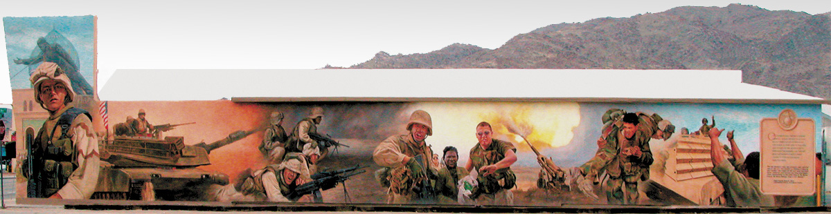 On March 21, 2003, the First Marine Division crossed from Kuwait and began Operation Iraqi Freedom. This mural is dedicated to the men and women of the Armed Forces, especially the Marines and Sailors from Marine Corps Air Ground Combat Center, Twentynine Palms. Marines from MCAGCC are depicted in this 100-foot mural in scenes taken from actual photographs, including the historic toppling of the 40-foot bronze statue of Saddam Hussein in Baghdad by 1st Tank Battalion and the rescue of Shoshana Johnson and seven POWs by the 3rd LAR. Painted by Oregon artist Don Gray.