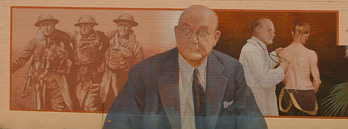Credited with populating this community during the years after World War I, by sending veterans suffering the effects of mustard gas here for the pure, healing air, the Pasadena doctor became one of our most prominent citizens and founding fathers. This 17 by 50 foot tribute features Dr. Luckie flanked by vignettes of WWI soldiers on the battlefield and the physician treating a patient.
